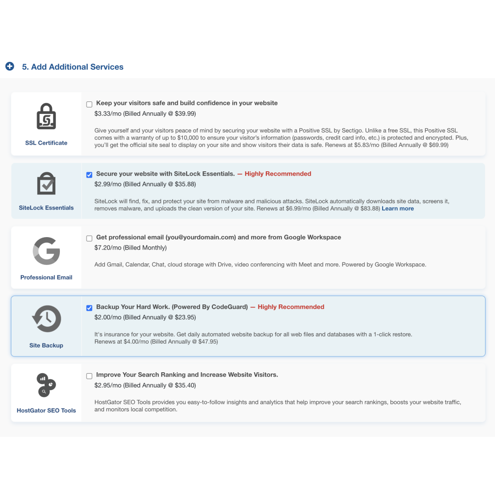 - No es necesario activar ninguna casilla extra en el apartado cinco, pero recomendamos contar con “SiteLock Essentials” y “Backup”